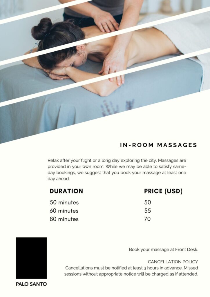 To book a massage, please contact the Front Desk. We recommend that you book a day in advance.
